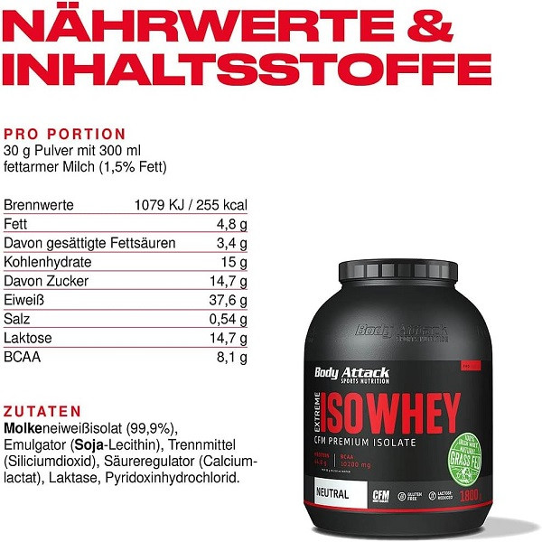 این بادی اتک را قادر میسازد پودر پروتئینی تولید کند که حاوی بیش از 90 درصد ایزوله در خالصترین شکل آن است. مزیت دیگر این است که کربوهیدرات ها و چربی ها تقریباً به طور کامل ناپدید می شوند. با توجه به محتوای کم لاکتوز در حدود 0.4 گرم در هر وعده، Extreme Iso Whey بادی اتک برای ورزشکاران مبتلا به عدم تحمل لاکتوز مناسب است. پودر پروتئین بادی اتک نیز فاقد گلوتن و آسپارتام است.