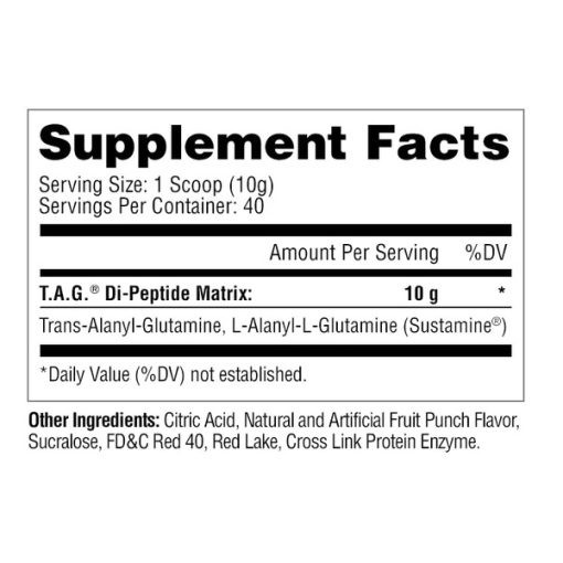 به دلیل ساختار شیمیایی منحصر به فرد طراحی شده “دی پپتیدی”، T.A.G. به اندازه کافی قوی است که در آب یا نوشیدنی های دیگر مخلوط شود. برخلاف ال-گلوتامین فرم آزاد [که بیشتر در روده ها استفاده می شود و 10 درصد آن را برای بافت ماهیچه ای باقی می گذارد]، T.A.G. بسیار بهتر است، زیرا 100٪ در جریان خون جذب می شود، به طور مستقیم منتقل می شود و به عمق بافت عضلانی تزریق می شود. این مکمل متابولیم برای ریکاوری عضلات طراحی شده است و از از دست رفتن گلوتامین عضلانی در حین تمرین جلوگیری می کند و از “کاتابولیسم پروتئین” جلوگیری می کند [یعنی از دست دادن عضلات]، بنابراین به حفظ و ساخت عضله در حین و بعد از تمرین کمک می کند. علاوه بر افزایش ریکاوری در حین و بعد از ورزش، T.A.G. همچنین یک راه حل ریکاوری کامل برای حمایت از سیستم ایمنی بدن، جلوگیری از کاتابولیسم عضلانی، افزایش سنتز پروتئین و ترشح هورمون های رشد ارائه می دهد و به همین دلیل به یک مکمل حیاتی در تمرین هر ورزشکاری تبدیل شده است.