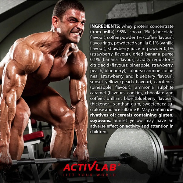 کنسانتره پروتئین وی (از شیر) 98٪، کاکائو 1٪ (طعم شکلاتی)، قهوه فوری 1٪ (طعم قهوه)، اسانس، پودر وانیل 0.1٪ (طعم وانیل)، پودر آب توت فرنگی 0.1٪ (طعم توت فرنگی)، پوره موز خشک 0.1% (طعم موز)، تنظیم کننده اسیدیته – اسید سیتریک (طعم آناناس، توت فرنگی، هلو و بلوبری)، رنگ: کارمین (طعم: توت فرنگی و بلوبری)، زرد (طعم هلو)، کاروتن (طعم آناناس)، آمونیاک -کارامل سولفیت (با طعم شیرینی، شکلات و قهوه)، آبی درخشان (طعم توت)، غلیظ کننده – صمغ زانتان، شیرین کننده ها: سوکرالوز و آسه سولفام کا.