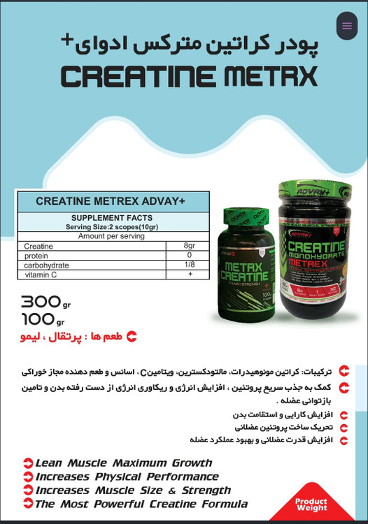 کراتین مترکس ادوای محصولی خالص و پیور می باشد که بسیار میکرونایذدبوده و قابلیت جذب سریع و حلالیت بسیار مناسبی نسبت به بقیه کراتین ها را دارا میباشد این محصول طعم دار بوده ومناسب برای تمامی ورزشکاران سرعتی و قدرتی می باشد همچنین این محصول سازگار با دستگاه گوارش بوده و در بدن ا احساس سنگینی به وجود نمی اورد و باعث ورم و نفخ معده نمی شود.