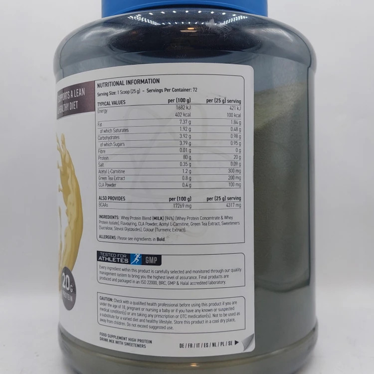 20 گرم پروتئین بیش از 4 گرم بی سی ای ای در هر سروینگ پودر سی ال ای، ال کارنیتین و عصاره چای سبز پشتیبانی از مدیریت وزن کربوهیدرات و قند پایین تست شده برای ورزشکاران محصول دارای گواهی حلال هر سروینگ برابر است با 25 گرم 72 سروینگ 1.8 کیلو گرم