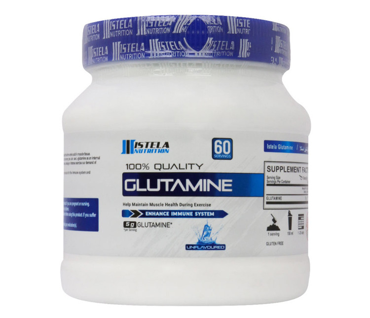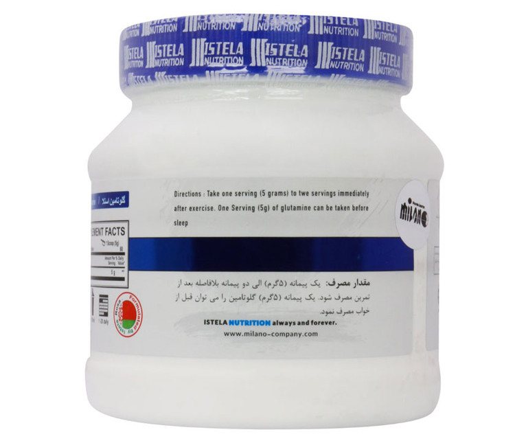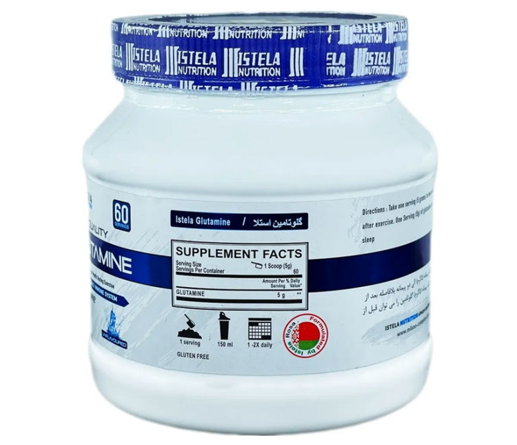 گلوتامین استلا نوتریشن در بسته بندی ۳۰۰ گرمی و بدون طعم به بازار عرضه گریده است که به رشد عضلات و جلوگیری از تخریب آن ها در ورزشکاران کمک می کند.