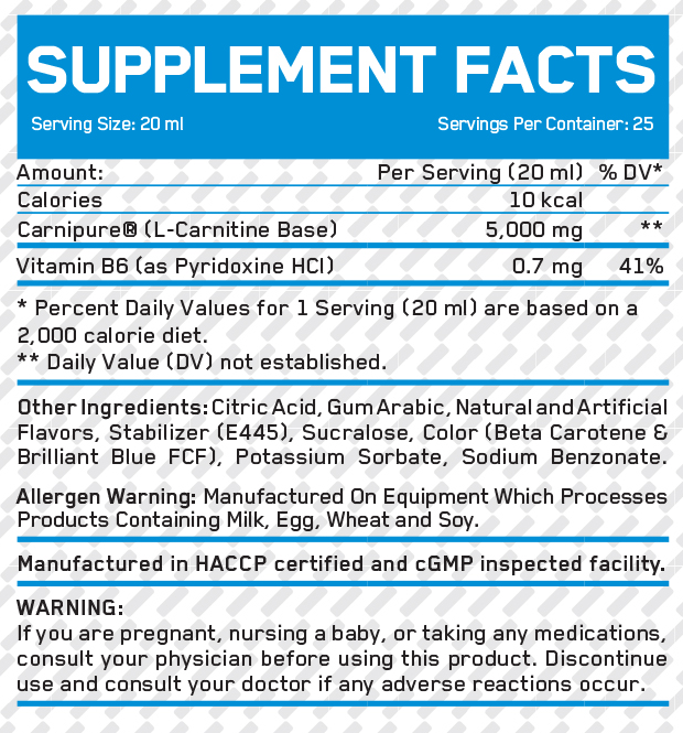 5000 میلی گرم ال کارنیتین کراپیور 0.7 میلی گرم ویتامین B6 طعم لیمو هر سروینگ برابر است با 25 میلی لیتر 20 سروینگ 500 میلی لیتر