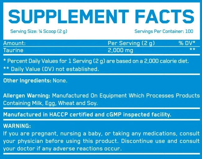 این محصول حاوی 200 گرم از آمینو اسید خاص تائورین است. هر وعده از این محصول از برند اوربیلد، حاوی 2 گرم (یک چهارم پیمانه) است. روزانه، یک الی دو وعده از تائورین اوربیلد را با معدهی خالی میل کنید. در روزهای تمرینی، دو وعده را قبل از ورزش میل کنید.