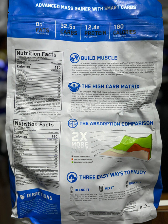 علاوه بر این، EB MASS BUILD دارای یک ماتریس کراتین مدرن و جامع است که برای تقویت قدرت و ریکاوری در ورزشکاران تمرین سنگین آزمایش شده و ثابت شده است. و در نهایت Everbuild-MASS BUILD دارای یک ترکیب اسید آمینه ضروری است که برای تحریک پاسخ آنابولیک از تمرین و مسیرهای متابولیک mTOR ساخته شده است و به عنوان یک سوئیچ آنابولیک عمل می کند. EB MAS BUILD به راحتی مخلوط می شود و طعم عالی در شیر یا آب دارد! شما را با درشت مغذی های با کیفیت بالا شارژ می کند، بدون اینکه شما را سیر کند، بنابراین می توانید از آن به عنوان تقویت کننده ای برای تغذیه روزانه خود استفاده کنید.