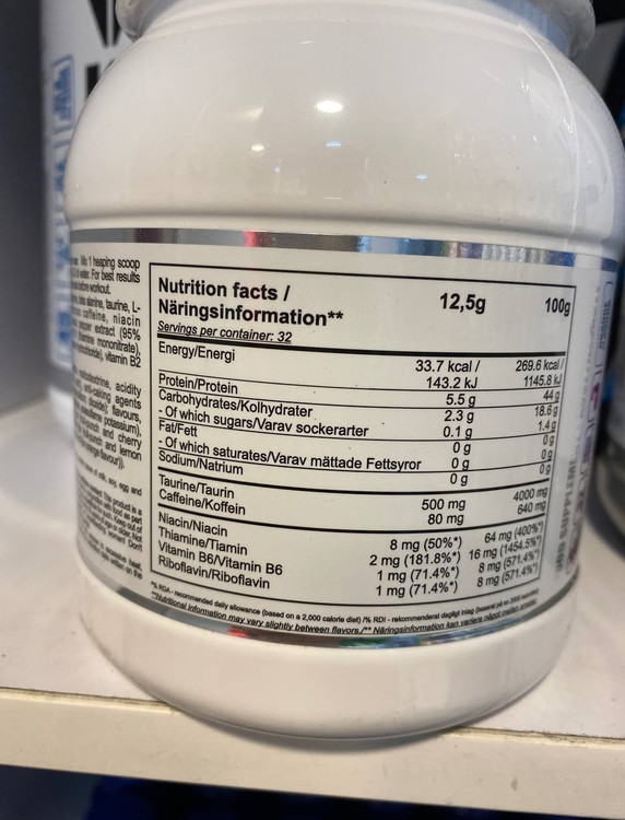*: 5000 میلی گرم آرژنین- 2000 میلی گرم بتا آلانین- 500 میلی گرم تائورین- 500 میلی گرم تیروزین- 80 میلی گرم کافئین- بدون چربی و نمک- هر سروینگ برابر است با 12.5 گرم- 32 سروینگ- 120.4 گرم