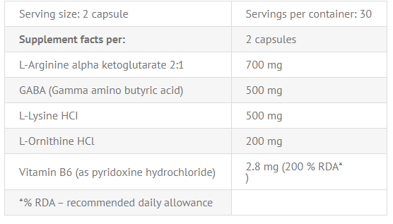 700 میلی گرم ال آرژنین آلفا کتوگلوتارات 2:1- 500 میلی گرم گابا- 500 میلی گرم ال لیزین HCI- 200 میلی گرم ال اورنیتین HCI- 2.8 میلی گرم ویتامین B6- تحریک تولید اچ جی اچ- حمایت از رشد عضلات و استخوان- بهبود عملکرد مردان- 60 کپسول