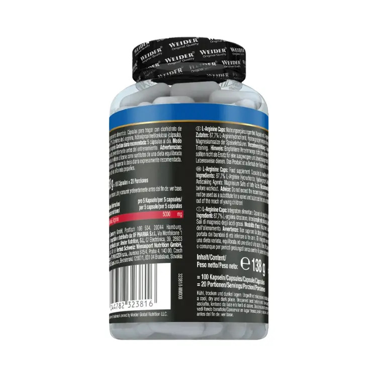 کپسول ال آرژنین ویدر (Weider L-Arginine 5000 mg) یکی از مکملهای قدرتمند برای افزایش پمپ عضلانی و بهبود عملکرد ورزشی است که توسط برند معتبر Jo Weider تولید شده است.