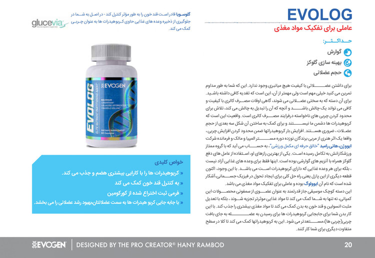 افزایش بار کربوهیدرات در حالی که افزایش چربی محدود شود یک هنر است. یکی از رازهایی که برای دستیابی به این هدف وجود دارد عوامل دفع گلوکز همراه با آنزیم های گوارشی است. کپسول ایولوگ ایوژن 60 تایی EVOGEN Evolog که به عنوان یک دفع کننده قند و چربی عمل می کند یک ترکیب قوی است که نه تنها به تجزیه موثرتر غذا کمک می کند بلکه با تعدیل مثبت سطح انسولین و قندخون به بدن کمک می کند تا مواد مغذی بیشتری را جذب کند. با انجا این کار بدن شما بیشتر مستعد انتقال کربوهیدرات ها به ماهیچه ها در مقایسه با بافت چربی است.