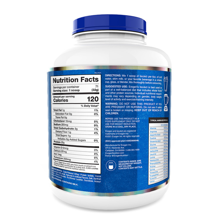 پروتیین وی ایزوله ایزوجکت ایوژن 1850گرم Evogen Isoject Pure Whey Protein Isolate یکی از مکمل هایی است که افرادی که به دنبال ایجاد موثرترین ایزوله وی هستند را هدف قرار داده است و دارای طعم مطلوبی می باشد و با استفاده از فناوری پیشرفته ساخته شده است. این محصول حاوی 110 تا 120 کالری در هر وعده می باشد.