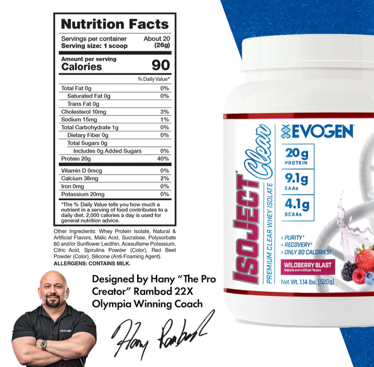 Evogen Nutrition IsoJect Clear یک ایزوله آب پنیر فوق خالص تک منبع ممتاز است که دارای فناوری شفاف کاملاً جدیدی است که توسط هانی رامبد توسعه یافته است. این ایزوله آب پنیر خالص استاندارد صنعت را با استفاده از فرآیند فیلتر سرد فوق سه گانه بالا می برد و تبادل یونی نمی شود. فرآیند بسیار دقیق به حفظ حداکثر فراهمی زیستی کمک میکند و از تلاشهای شما برای ساختن هیکل نهایی پشتیبانی میکند.