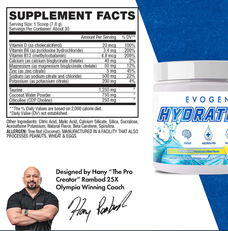 Evogen Nutrition Hydration از ترکیبی کاملا متعادل از پودر آب نارگیل، سدیم و پتاسیم استفاده می کند. این نیروگاه سه گانه برای جبران مواد معدنی حیاتی از دست رفته در طول فعالیت بدنی شدید هماهنگ عمل می کند.