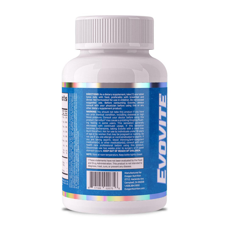 CarnoSyn Beta-alanine: اغلب فرمولاسیون های قبل از تمرین را مشاهده می کنید که حاوی بتا آلانین هستند. متأسفانه تحقیقات این موضوع را تایید نمی کند. آنچه تحقیقات از آن حمایت می کند مصرف دوزهای کمتری از بتا آلانین در طول روز است. با در نظر گرفتن این موضوع، EVOVITE دو بار در روز مصرف می شود و با محصولات دیگری مانند EVP XTREME، که حاوی بتا آلانین نیز هستند، ادغام می شود. این دو به اطمینان از حداکثر سنتز کارنوزین درون عضلانی به دلیل سایر کوفاکتورهای مورد نیاز برای تولید کارنوزین که به راحتی در دسترس هستند، مانند منیزیم، ATP، هیستیدین و غیره کمک می کند.