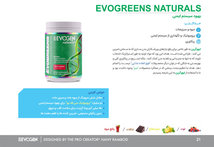 کپسول ایوگرین ایوژن EVOGEN Evogreens به طور خاص برای رفع نیازهای ورزشکاران با فعالیت بدنی شدید طراحی شده است. هدف از ساخت این مکمل تقویت کننده سیستم ایمنی بدن این است که مواد تشکیل دهنده ای را در خود داشته باشد که به سم زدایی و تغذیه بدن و همچنین تسریع ریکاوری و سلامت کلی کمک کند.